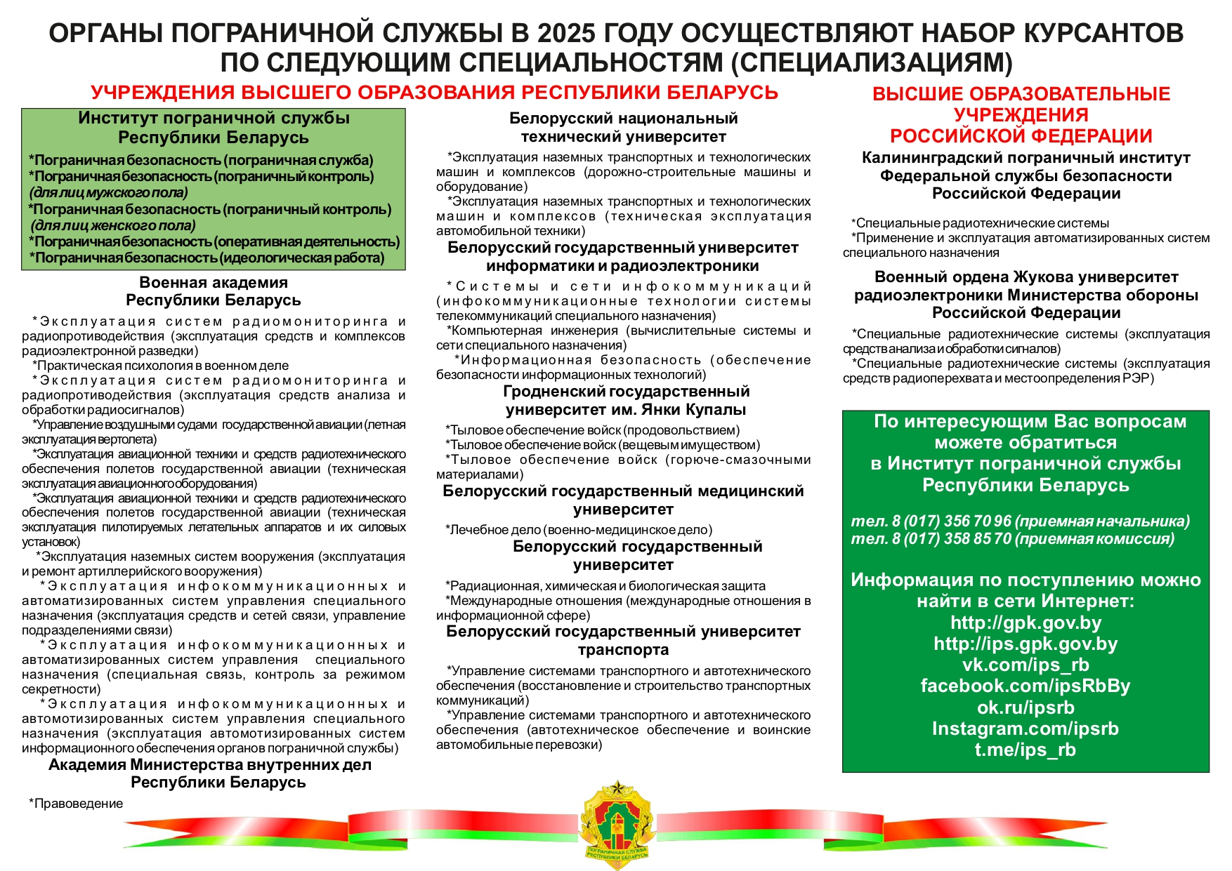v «ПРЕДУПРЕЖДЕНИЕ И ЛИКВИДАЦИЯ ЧРЕЗВЫЧАЙНЫХ СИТУАЦИЙ» с присвоением квалификации «Инженер по предупреждению и ликвидации чрезвычайных ситуаций» (очная (дневная) форма получения образования (конкурс проводится среди юношей) и заочная форма получения образования);